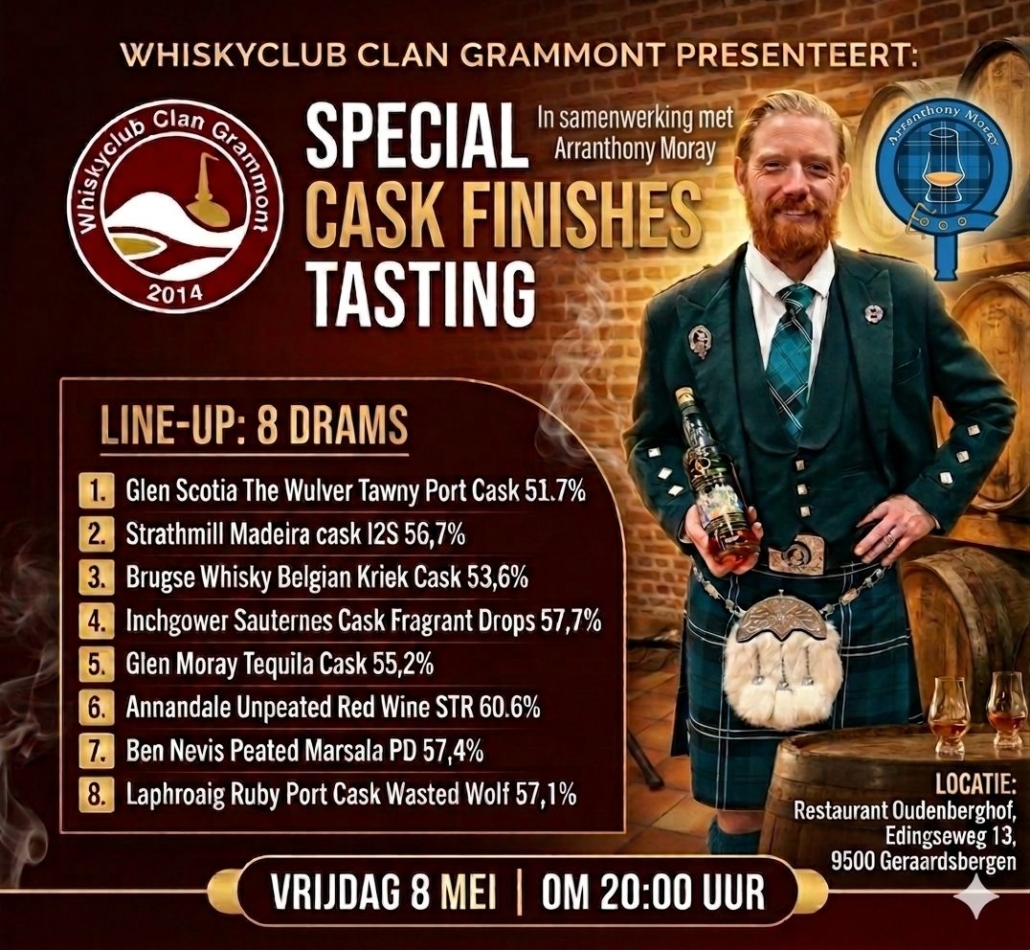Whiskyvrienden, maak je klaar voor een ontdekkingsreis langs unieke vaten! Op vrijdag 8 mei duiken we met Whiskyclub Clan Grammont, in samenwerking met Arranthony Moray, diep in de wereld van de ‘Special Cask Finishes’.